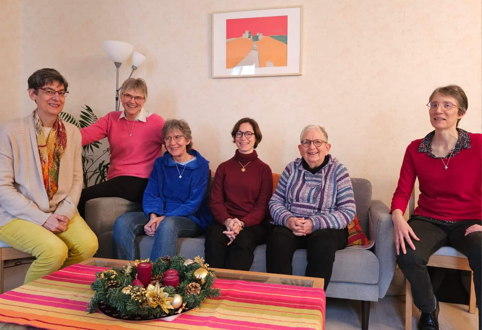 Nous sommes six en communauté : Pascale, Christine, Gudrun, Marie-Odile (stagiaire), Marie-Thérèse, Véronique (de gauche à droite sur la photo). Nous vivons dans un immeuble ordinaire avec vue sur la place publique.